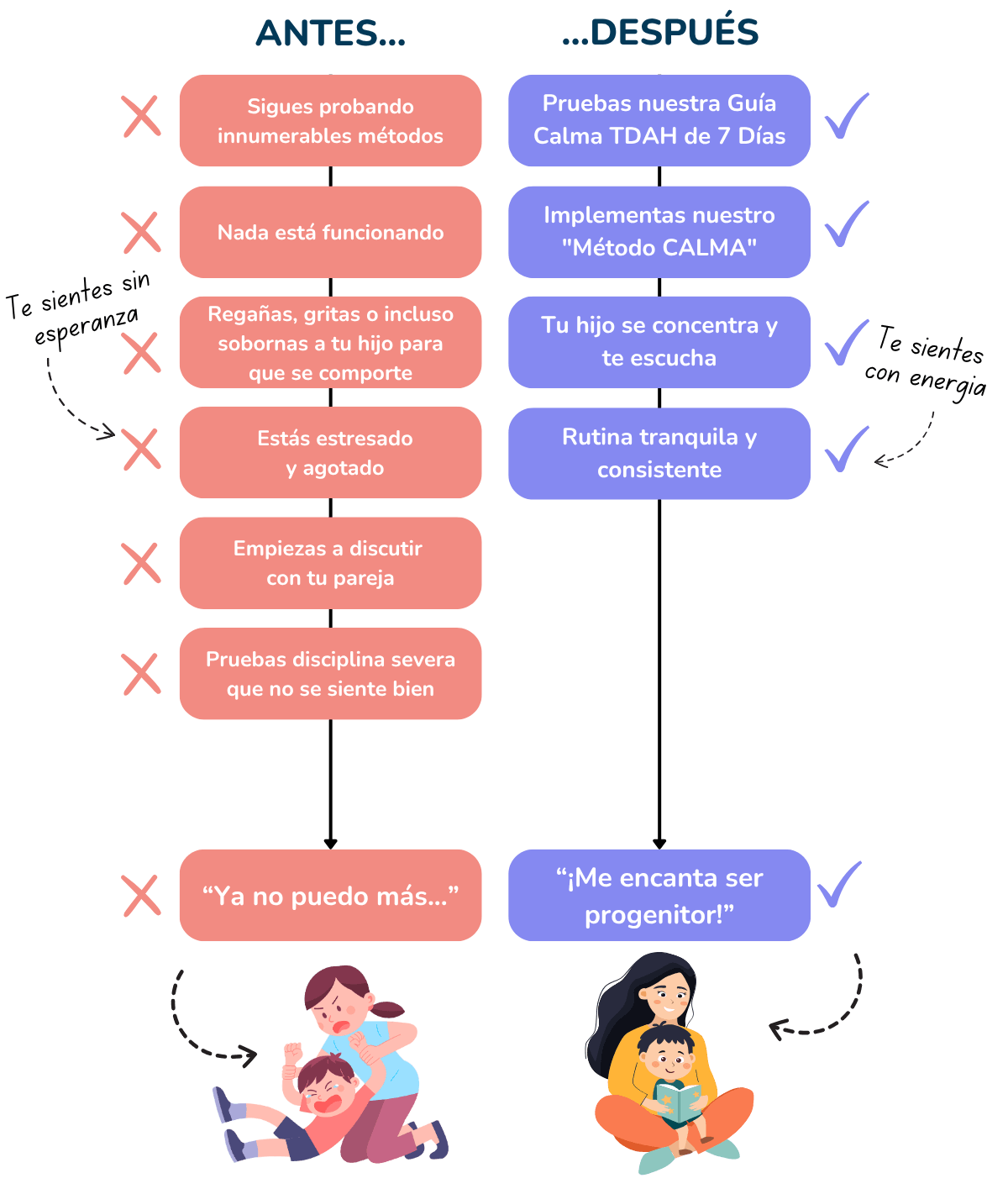 Tu hijo con TDAH comenzará a escuchar y seguir instrucciones. No más repetirte constantemente, no más batallas diarias. Todos disfrutarán de interacciones más pacíficas.